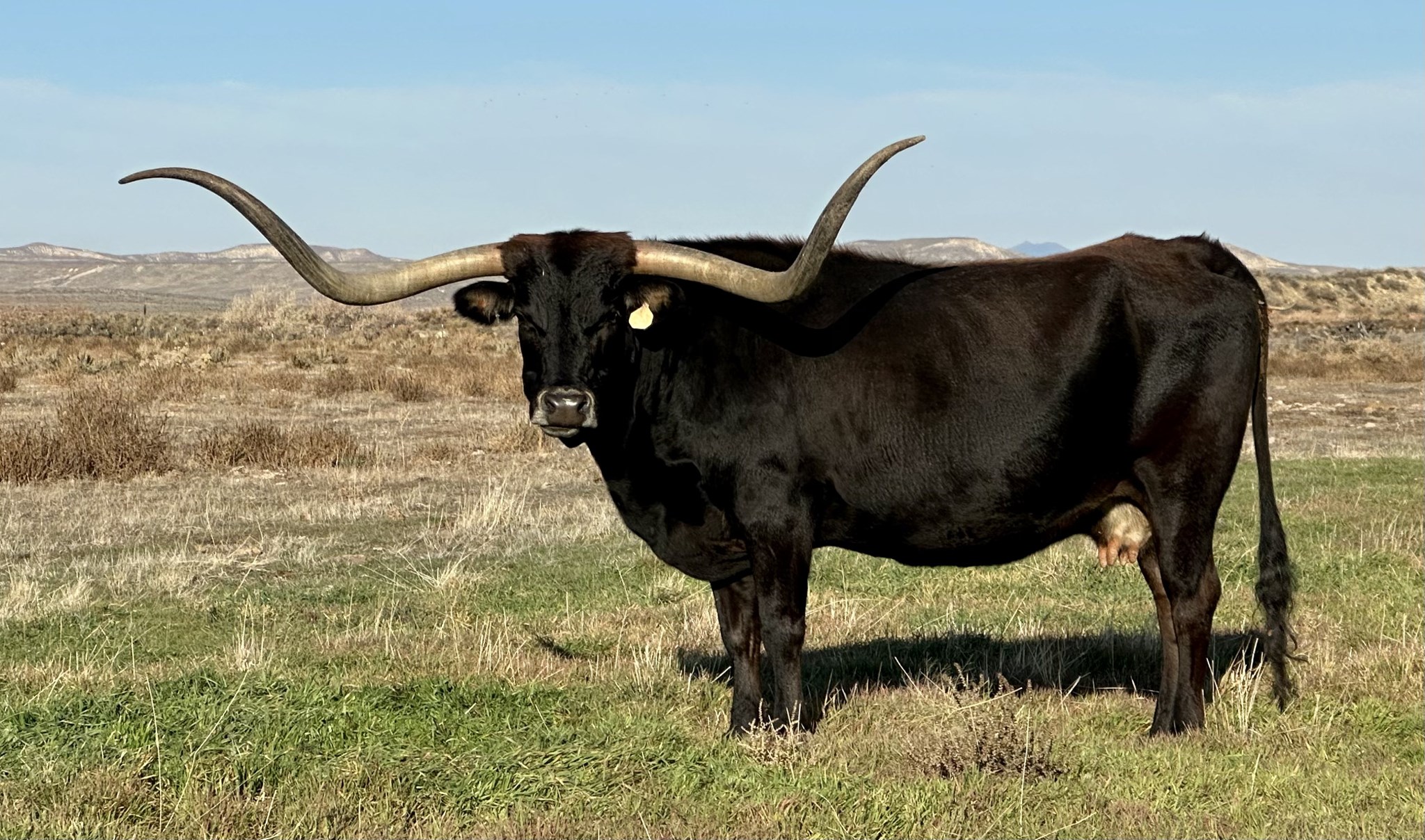 Huge bodied cow with a bunch of rolling horn. Bred to BR Jungle Jim for 2026. One front teat gets big when she calves and then gets smaller as time goes by.